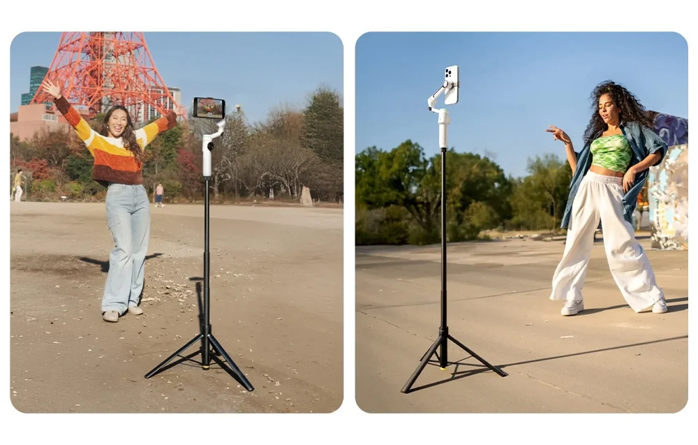 A beépített szelfibot akár 1,1 méterig kihúzható, így látványosabb perspektívát és jobb képkompozíciót érhetsz el. Jól használható vlogokhoz, csoportképekhez, kreatív videókhoz vagy olyan jelenetekhez, ahol egy magasabb nézőpont sokat számít.